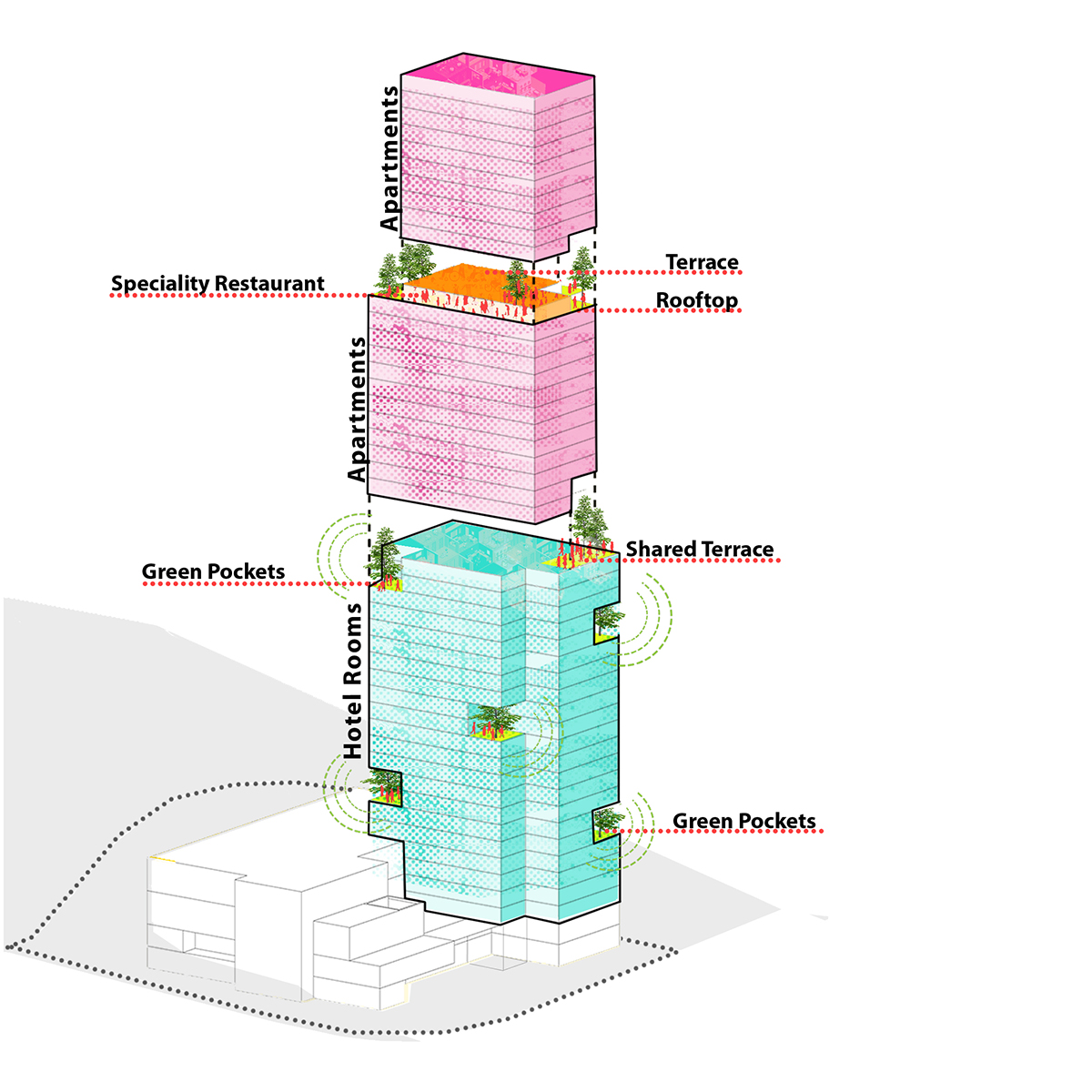 The terraces or pockets stand vibrant, celebrated and exposed contrasting the graceful and reserved uninterrupted parts of the tower which host the hotel rooms or apartments.