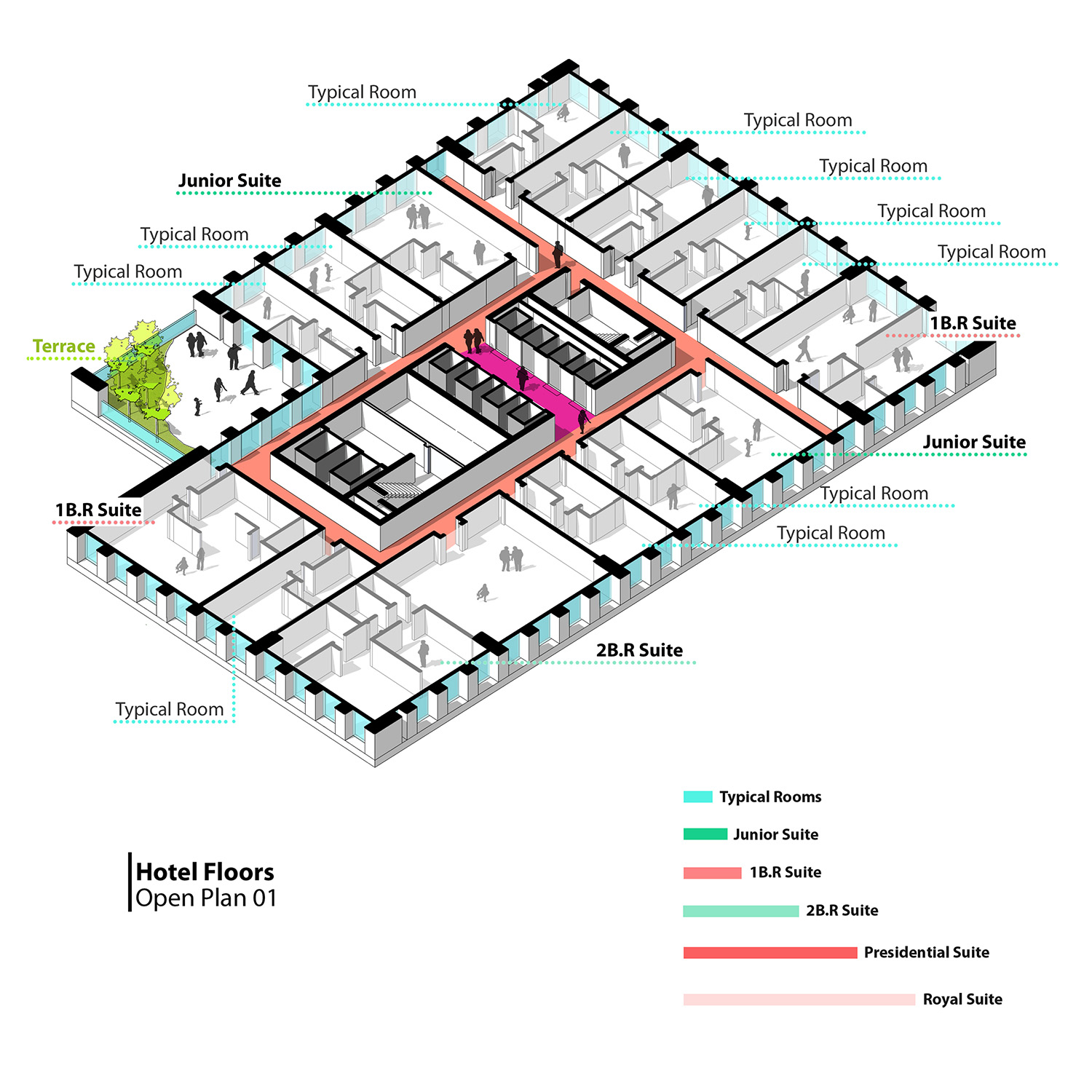 Both vibrant and graceful define a plural language of quietness and vitality that is the Hotel. And both types of space are complemented with landscaped space; either through the large public terraces or privatized quiet pocket gardens; each serving its users according to preference.