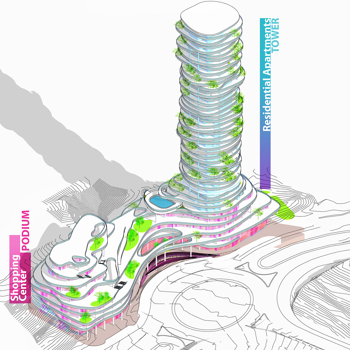 The Podium presents a cascading base that elevates to receding floor outlines revealing engaging terraces as you go up; Podium is host to a shopping center with various commercial functions, diverse in use, scale and interaction with the outdoor.
