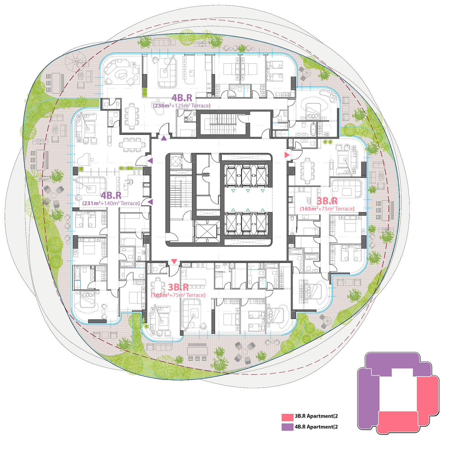 As inspired from the layers of the earth, topography, and geology; the massing composition develops and integrates with earthen layers, creating an extended podium that has curved outlines that cascade as elevated creating exposed terraces and an animated tower that is light and interchangeable in its organic outlines; vibrant with outdoor gardens.